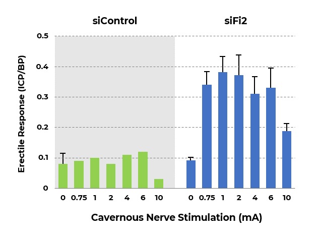 Preclinical studies by MicroCures and our academic collaborators at The Albert Einstein College of Medicine demonstrate that application of MCR-420 to the cavernous nerves after injury enhances nerve repair and leads to recovery of erectile function (Baker et al., 2021). Application of MCR-420 after nerve crush led to a full recovery of erectile response in rats several weeks after injury and treatment, while control treated rats showed very limited to no recovery of erectile response to nerve stimulation. More impressively, after complete transection of the cavernous nerves (an injury that results in a gap of several millimeters between the severed nerve endings) application of MCR—420 led to nerve regeneration and partial recovery of erectile response: