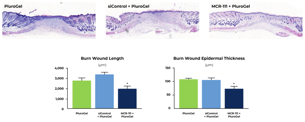 When combined with PluroGel, a commonly used wound and burn dressing, MCR-111 resulted in statistically significant reductions in both burn wound length and burn wound epidermal thickness as compared to PluroGel alone and control.  Histology images below show that the wounds treated with the MCR-111 and PluroGel combination demonstrated a structure most similar to unwounded skin.