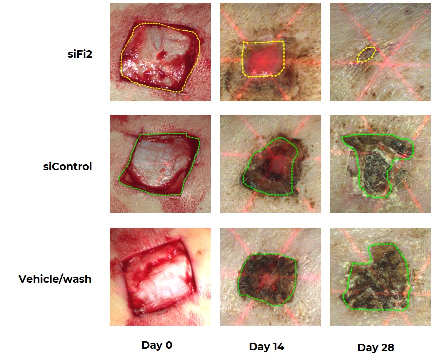 The images below, taken at Week 6, provide clear visual evidence of improved would repair for siFi2-treated subjects as compared to placebo and control.
