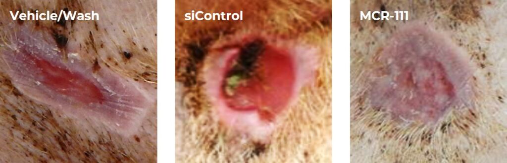 Pigs treated with MCR-111 demonstrated significantly improved and accelerated healing of excisional wounds as compared to both placebo and control subjects.  Wounds were measured precisely using 3D laser scanning technology in order to quantify the remaining open area (highlighted within each wound).