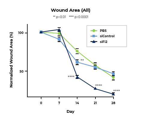 Line graph of normalized wound area at designated timepoints shows MCR-111-treated wounds healed at a significantly improved rate compared to both siControl and placebo.